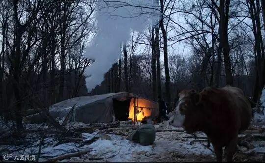 ▍冬季,由于砍伐区位于偏远山区交通不便,工人们用塑料布搭建的工棚成了伐木工人临时的家。闭塞的山区没有手机信号,没有水和电,工作也极其枯燥。