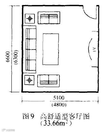 3.客厅的“高舒适”尺寸要求,大致为开间5.1m,进深6. 6m,建筑面积33. 66㎡,如图9 所示。这种尺寸无论在开间方向或进深方向摆放电视,均可满足42 英寸及以上彩电(背投、等离子、液晶等平板电视)的观看距离要求,所以,它是“高舒适”的客厅尺寸。