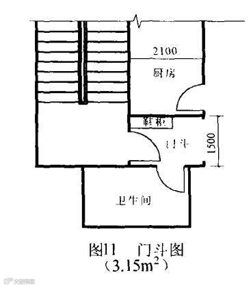 80㎡以上(不含80㎡) 套型宜设置门斗,它是进入户内的过渡空间,装修时做上一个造型优美的大门套,称之为玄关。它的开间尺寸宜为1. 5m以上,具体如图 11 所示。门厅是户建筑面积很大,比如160㎡以上时,方予设置的空间。
