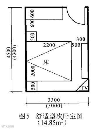 次卧室为住户非主人使用的卧室,它的最低“适用”开间中到中尺寸是3. 3m(净3. 0m) ,进深中到中尺寸是4. 5m(净4. 2m),如图5。这里讲的是最低“适用”要求,因为小于这个尺寸就会给家具布置和人的活动带来不便,也就是说小于这个尺寸的房间就不应设计为卧室,而应设计为书房、儿童房、保姆房等功能的房间。若户建筑面积比较大或很大,次卧室也分别提高到上述主卧图1或图2的标准,这时次卧室也就分别达到了“舒适”或“高舒适”的要求了。