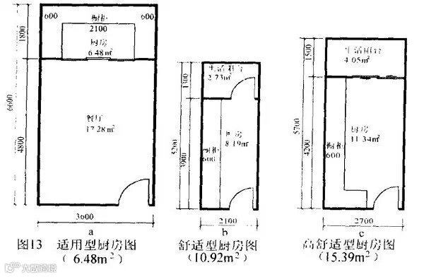 厨房是住宅非常重要的房间,它与套型舒适度关系极为密切。随着户建筑面积的增大,它的尺寸也随之加大。厨房的“适用”、“舒适”、“高舒适”尺寸大致如图13a、 b、 c所示。“高舒适“型厨房”对于时尚家庭,若用作西餐厨房,可兼作家人小餐厅。
