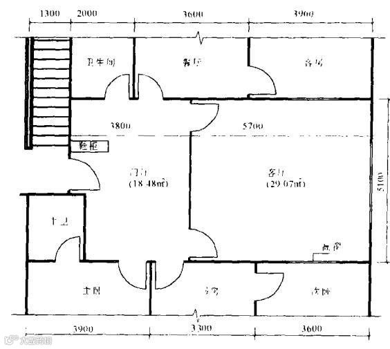 这里要说的是它不是二厅而是三厅,比多数户型多了一个面积达18㎡的门厅,是否浪费呢? 从图中可见,门厅中集中了七个门之多,因此这个门厅不仅充分起到了过渡、缓冲作用,而且使其它每个房间均很规整,很舒适, 因此它并不浪费。
