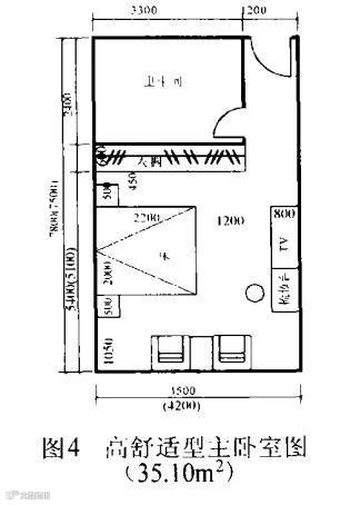 3.主卧室的“高舒适”开间中到中尺寸是4.2m(净3. 9m) ,进深中到中尺寸是7. 5m(净 7. 2m)。这时家具摆放和人的活动会更加方便舒适;不仅如此,到了这一级,主卧室就应该配有主卫生间和进入式衣帽间( 图3)。或不设进入式衣帽间,以把卫生间做大,使洗浴更加舒适(图4)。