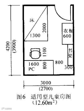 儿童房设计成开间3. 0m、进深 4. 2m、面积12. 60㎡,可满足家具摆放和人的活动要求,即“适用”要求(具体可参见图6)。当然,如果户型面积足够大,将儿童房按图5 次卧尺寸(开间 3. 3m、进深4. 5m、面积14. 85㎡)或按图 1 主卧尺寸(开间3. 6m、进深4. 8m、面积17. 28㎡) 设计,则可使儿童房达到“舒适”或“高舒适”的要求。同时,儿童是要长大成人的,按次卧或“适用”主卧设计儿童房,还可使儿童长大成人后不必更换房间,仍然室有适用舒适的房间供其使用。另外,设置儿童房还可使住宅套型设计更方便,即将受户面宽和进深限制不能将其设计为主卧、次卧、客房的空间设计为儿童房。