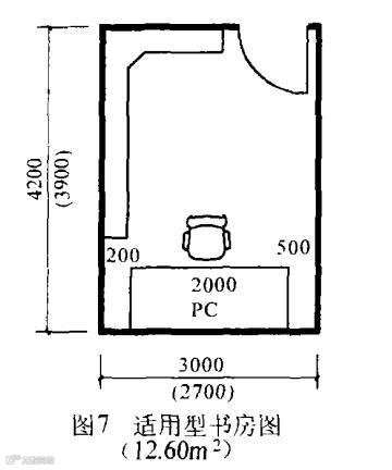 三室以上的户型宜设置书房。书房是供主人学习或家庭办公( 工作) 的房间。因无需摆放大床( 2. 2m x 2. 0m)和床头橱等家俱,所以其尺寸要求也不像卧室那样严格, 具体可参见图 7。它也像儿童房一样可使住宅套型设计更方便, 即将受户面宽和户进深限制,不能将其设计为主卧、次卧、客房的空间设计为书房。当然,图7 基本上是仅满足书房最低使用功能的“适用”要求,如果建筑面积足够大,也可按次卧图5、主卧图1、图2 的开间进深尺寸设计书房,使书房达到“舒适”或“高舒适”的要求。这样还带来另一个好处,即书房可随时据需要改为卧室,增加了房间使用的灵活性。