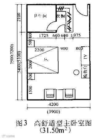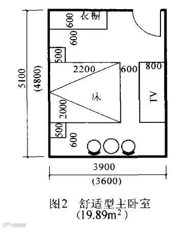2.主卧室的“舒适”开间中到中尺寸是3. 9m(净3. 6m) ,进深中到中尺寸是5.1m(净4. 8m)。这时家具摆放和人的活动是比较方便舒适的(图2) 。