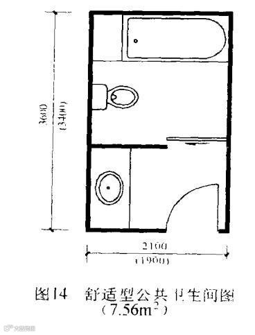 卫生间分公共卫生间和主卧卫生间。主卧卫生间以接近方形为佳( 便于洁具布置) ,尺寸可参照图3和图4 或适当加大设置,这个尺寸摆放矩形或大三角形喷水按摩浴缸均够。公共卫生间以矩形为佳,因这样既可少占面宽又可将洗漱与浴厕隔开,使之可供一人洗漱一人浴厕同时使用,增加它的使用功能,使户型更加“适用”或“舒适”,具体如图14 所示。该图尺寸基本上可达到“舒适”标准,若要改成“适用”或“高舒适”标准,可将其开间、进深适当缩小或加大。