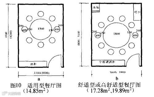 餐厅是住户家人或家人与亲友进餐的房间。它的最小“适用”尺寸是开间3. 3m、进深 4. 5m、建筑面积14. 85㎡,如图10a所示。由图可见,摆放一八人餐桌和八把餐椅,这已是最小“适用”尺寸了,也就是说,餐厅的开间尺寸最小是3. 3m,再小就不能用作餐厅了。