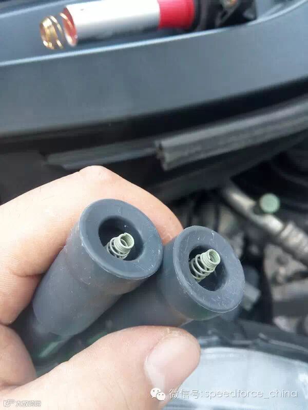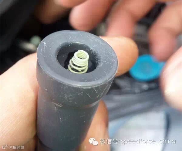 拆下原车高压包后拔出点火杆见到严重氧化的弹簧,上面满布氧化物。