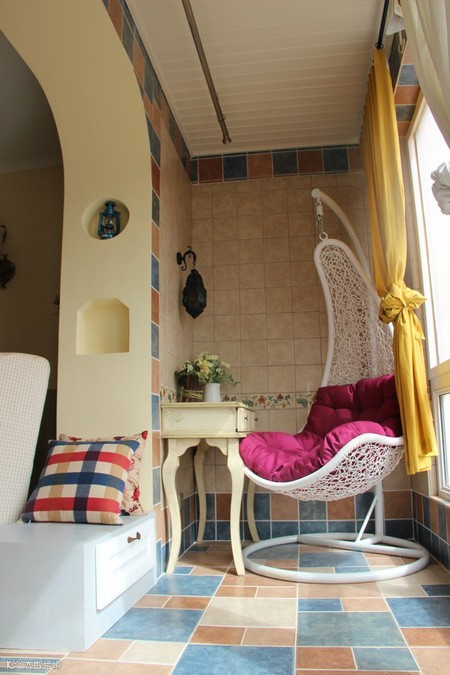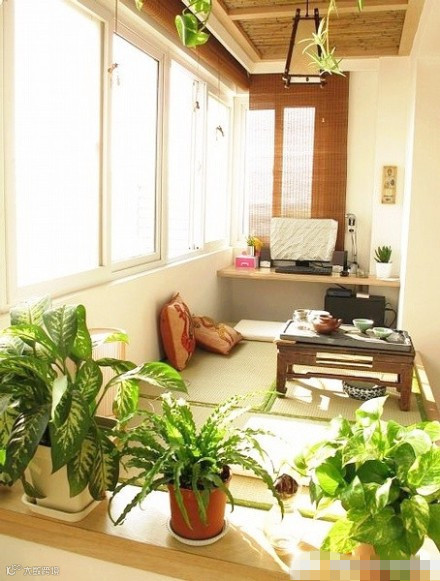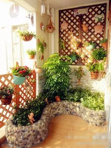 鹅卵石砌成的小花坛不规则的占据了阳台的一角,茂盛的绿植使阳台充满了生命力。