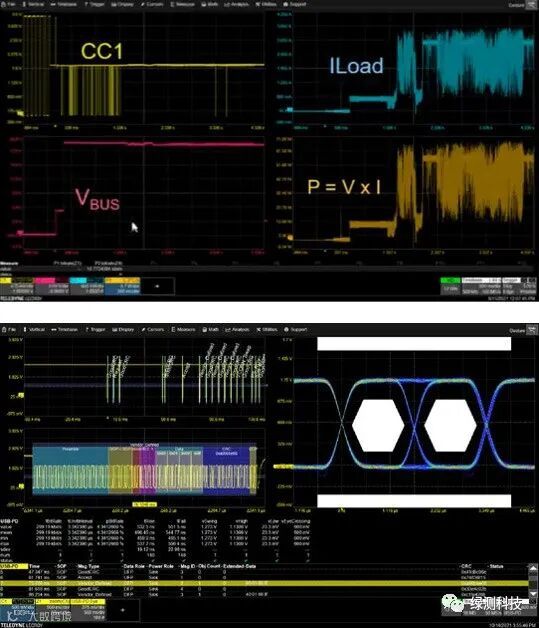若需要更强大的PD协议波形识别,可以选用示波器添加PD触发条件,并对整个通信的波形进行观察。可以对波形进行触发、解码、测量、物理测量(眼图功能)。对工程师分析失效过程提供优秀的工具。