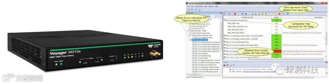 其中,力科作为老牌的协议分析设备厂商,拥有非常强大的仪器制造能力和协议分析软件。其中M310e协议分析仪不仅可以作为PD一致性测试硬件,同时支持10Gb/s速率下USB 3.2 的高速解码、流量生成、Display Port 的视频解码等功能。