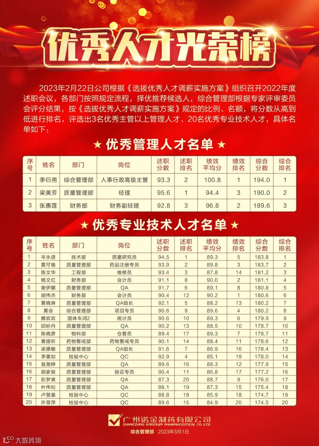 2023年4月3日,诺金公司在行政楼会议室为2022年度述职选拔优秀人才评选出的3名优秀主管以上管理人才、20名优秀专业技术人才进行了颁奖。