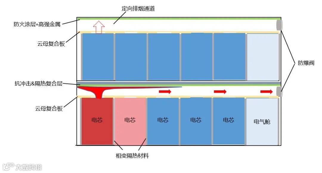 热电分离:利用云母复合板隔离电芯区及电气舱,与“阻火层”一起构成导流排气通道,实现热电分离;定向排烟通道末端设计防爆阀,热失控后当内部压力达到一定值时防爆阀自动打开,定向泄压;