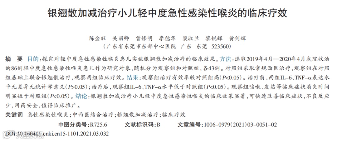[21]陈金旺,关丽卿,曾修明,等.银翘散加减治疗小儿轻中度急性感染性喉炎的临床疗效[J].内蒙古中医药,2021,40(3):51-52.