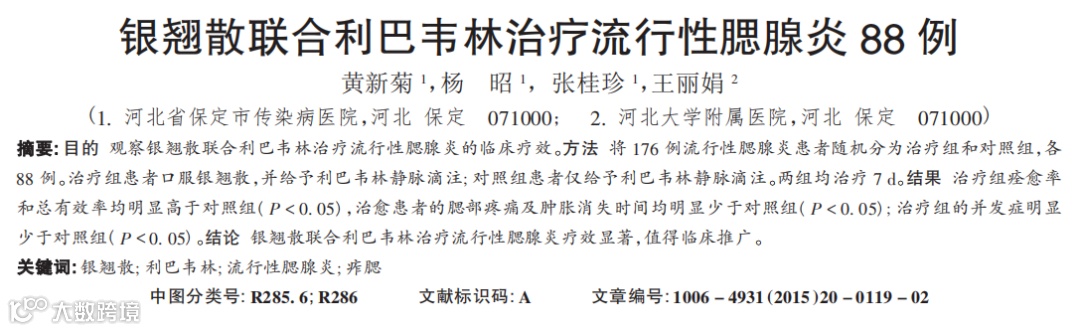 [14]黄新菊,杨昭,张桂珍,等·银翘散联合利巴韦林治疗流行性腮腺炎88例[J].中国药业,2015,24(20):119-120.