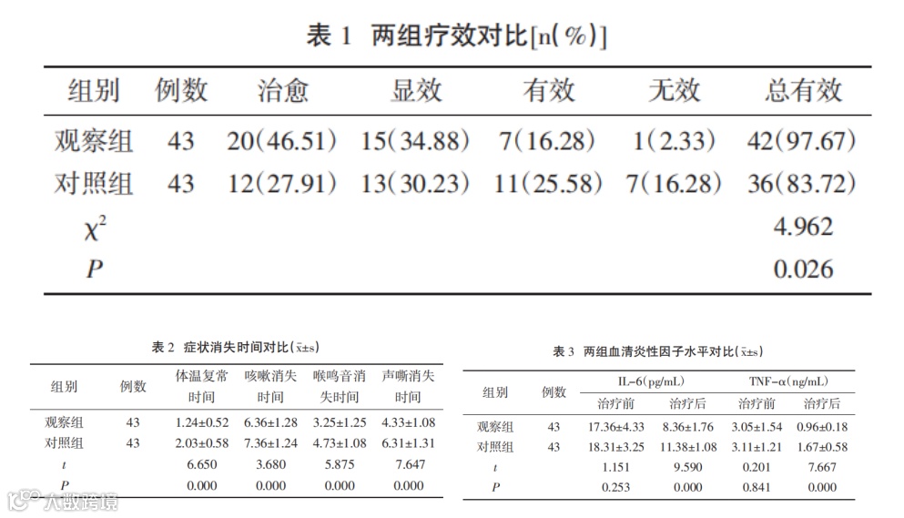 陈金旺等[21]观察常规西药联合银翘散加减治疗小儿轻中度急性感染性喉炎的临床疗效,结果显示该疗法可快速改善患儿临床症状,且不良反应少,安全性高。
