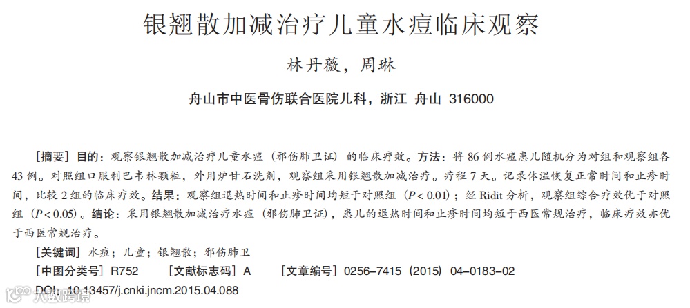 [16]林丹薇,周琳.银翘散加减治疗儿童水痘临床观察[J].新中医,2015,47(4):183-184.
