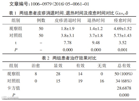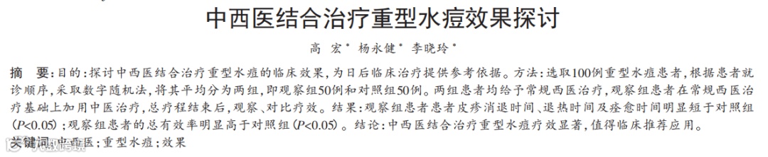 高宏等[15]在常规西医治疗基础上应用银翘散化裁治疗重症水痘患者50例,治疗1周后,患者症状均消失,治愈率为100%。
