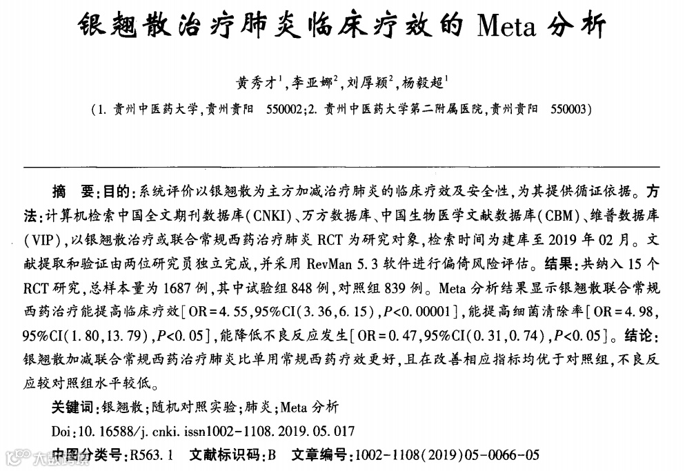 [8]黄秀才,李亚娜,刘厚颖,等·银翘散治疗肺炎临床疗效的Meta分析[].贵阳中医学院学报,2019,41(5):66-70.