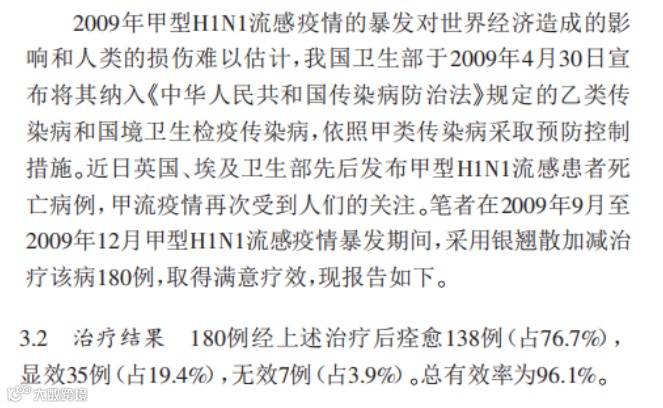 刘芳[3]运用银翘散治疗甲型H1N1流感患者180例,结果显示治疗有效率为96.1%。