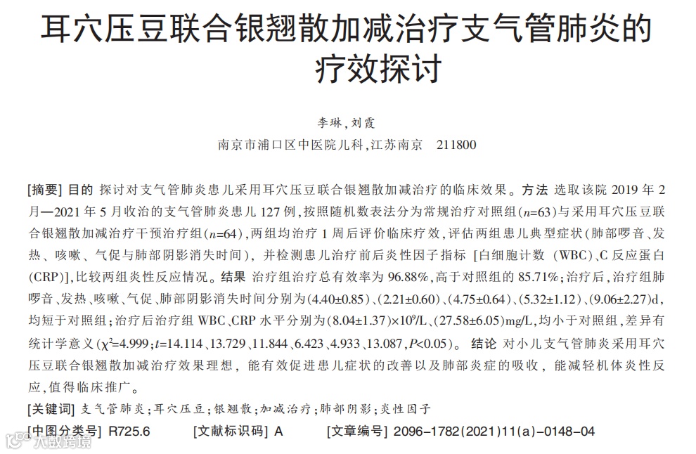 [7]李琳,刘霞·耳穴压豆联合银翘散加减治疗支气管肺炎的疗效探讨[J].系统医学,2021,6(21):148-151.