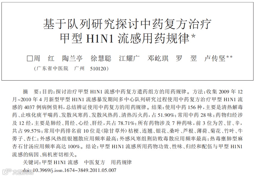 [2]周红,陶兰亭,徐慧聪,等.基于队列研究探讨中药复方治疗甲型H1N1流感用药规律[J].世界科学技术(中医药现代化),2011,13(5):777-782.