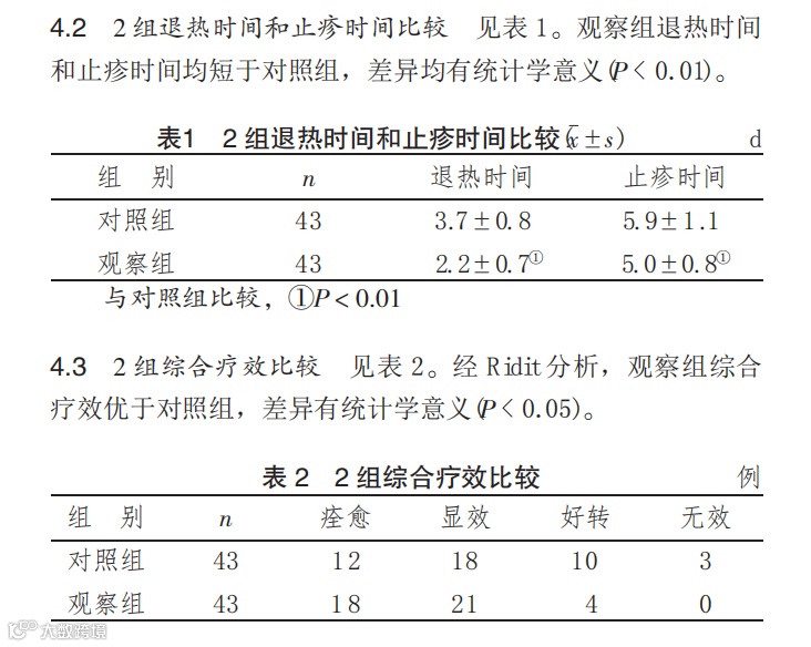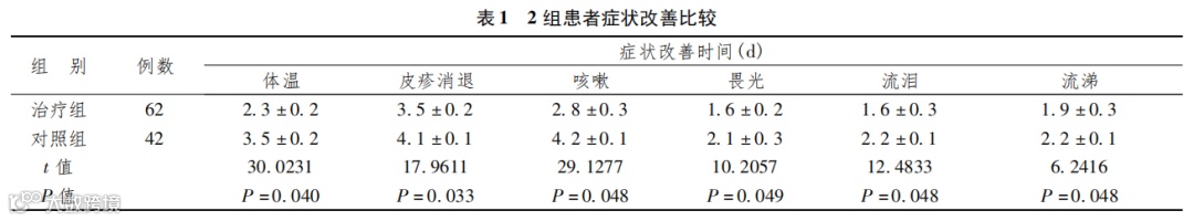 段淑红等[17]应用银翘散加减治疗麻疹62例,结果显示银翘散加减在缩短治疗时间方面优于单纯西药,且无并发症发生。
