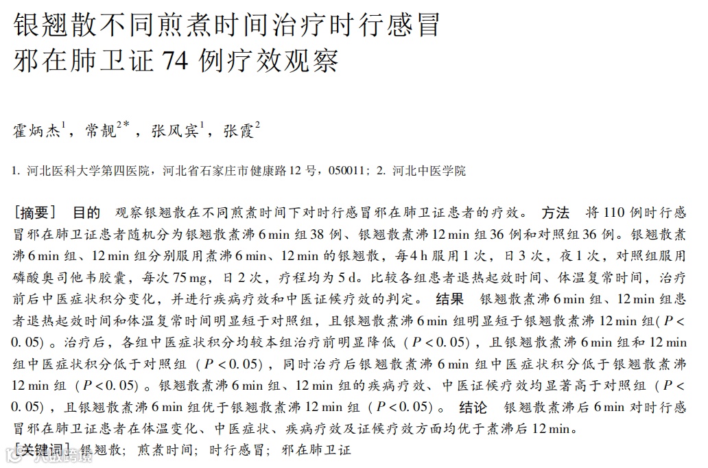 [5]霍炳杰,常靓,张风宾,等.银翘散不同煎煮时间治疗时行感冒邪在肺卫证74例疗效观察[J].中医杂志,2020,61(12):1065-1068.