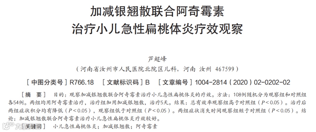 [11]芦超峰.加减银翘散联合阿奇霉素治疗小儿急性扁桃体炎疗效观察[J].实用中医药杂志,2020,36(2):202-203.