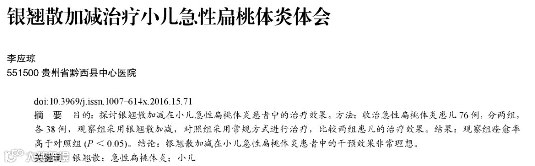 [12]李应琼.银翘散加减治疗小儿急性扁桃体炎体会[J].中国社区医师,2016,32(15):118,120.