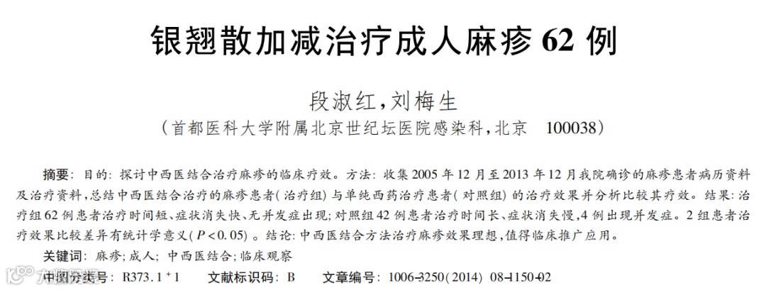 多数医家应用清热解毒、辛凉透疹的银翘散治疗麻疹初期。