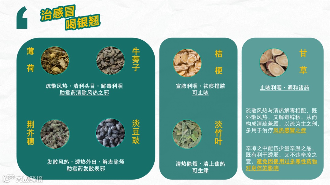 银翘散方剂遵循中医“君臣佐使”的配伍原则,方中金银花、连翘为君,此二味气味芳香,既能疏散风热、清热解毒,又可辟秽化浊;薄荷、牛蒡子味辛而性凉,疏散风热,清利头目,且可解毒利咽;荆芥穗、淡豆豉解表散邪,此两者虽辛温,但辛而不烈,温而不燥,配入辛凉解表方中,增强辛散透表之力,以上四药共为臣药;芦根清肺生津止渴,竹叶清泄上焦、除烦,皆为佐药;桔梗宣肺利咽,甘草清热解毒,二药相伍,即《伤寒论》之桔梗汤,有利咽止痛之功,甘草又可调和药性,护胃安中,是属佐使之用。