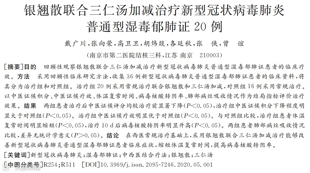 [6]戴广川,张向荣,高卫卫,等,银翘散联合三仁汤加减治疗新型冠状病毒肺炎普通型湿毒郁肺证20例[J.安徽中医药大学学报,2020,39(5):1-4.