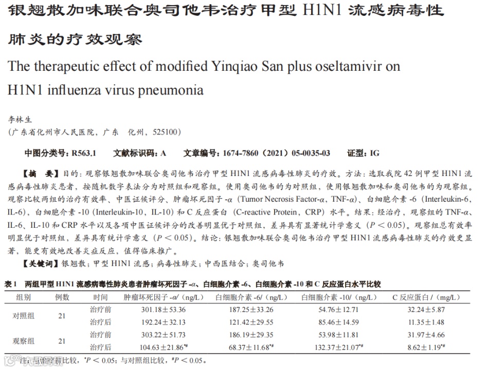 [4]李林生.银翘散加味联合奥司他韦治疗甲型H1N1流感病毒性肺炎的疗效观察[J].中医临床研究,2021,13(5):35-37.