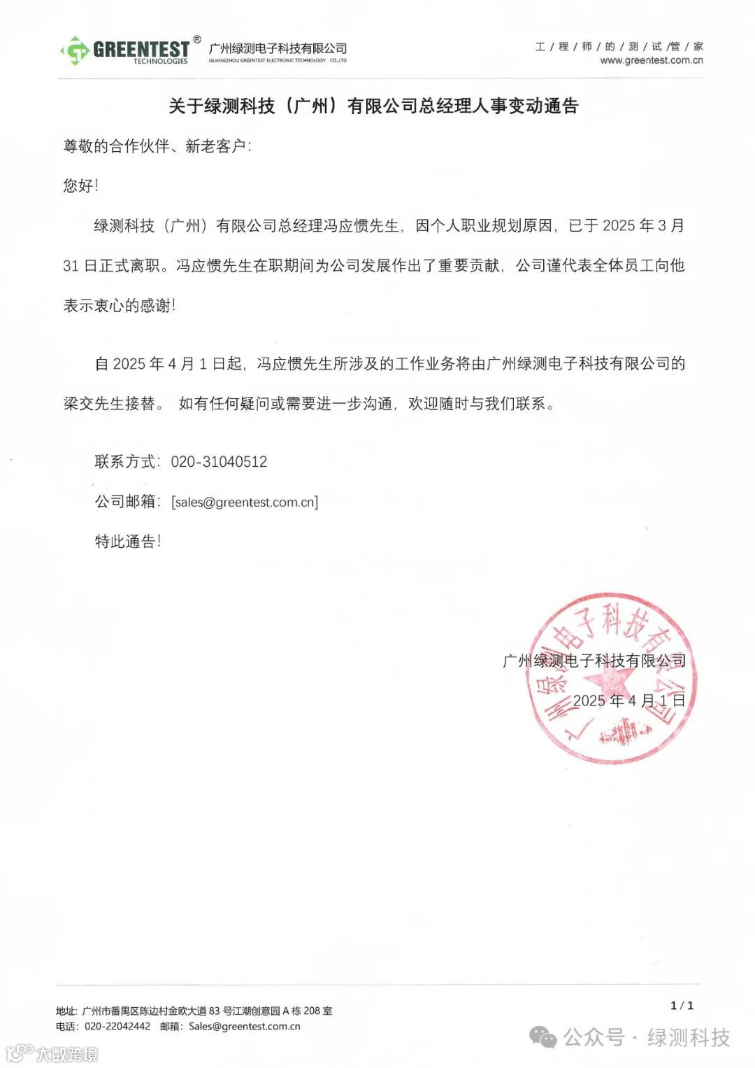 绿测科技(广州)有限公司总经理人事变动通告 绿测科技