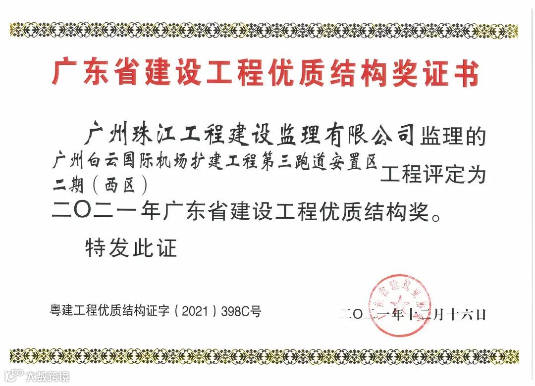 广州白云国际机场扩建工程第三跑道安置区二期项目(西区)荣获2021年度“广东省建设工程优质结构奖”。
