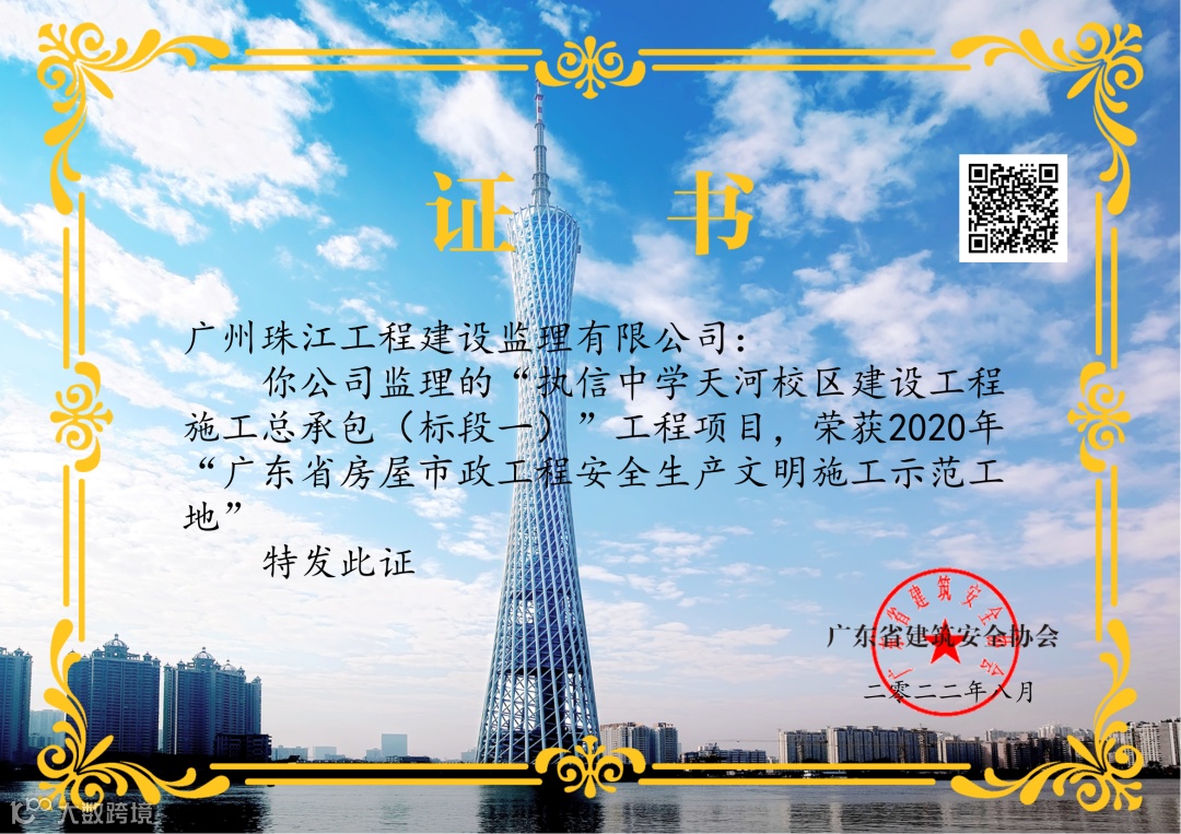 执信中学天河校区建设工程项目(标段一)荣获2020年度“广东省建设工程项目施工安全生产标准化工地”。