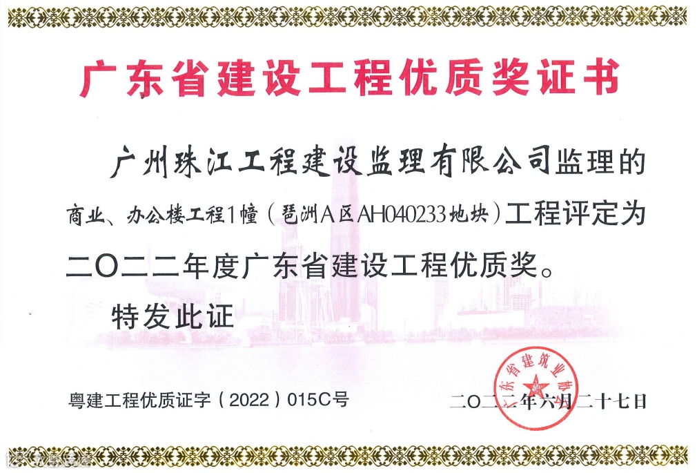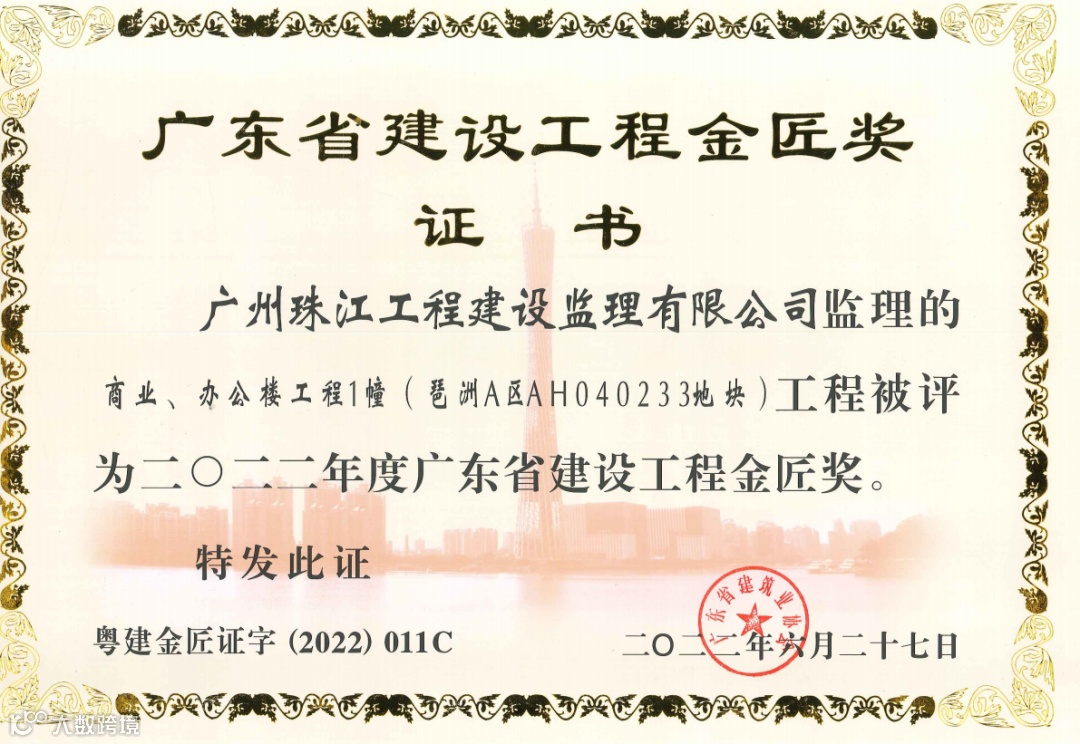 琶洲A区AH040233地块项目荣获2022年度广东省建设工程优质奖和金匠奖。