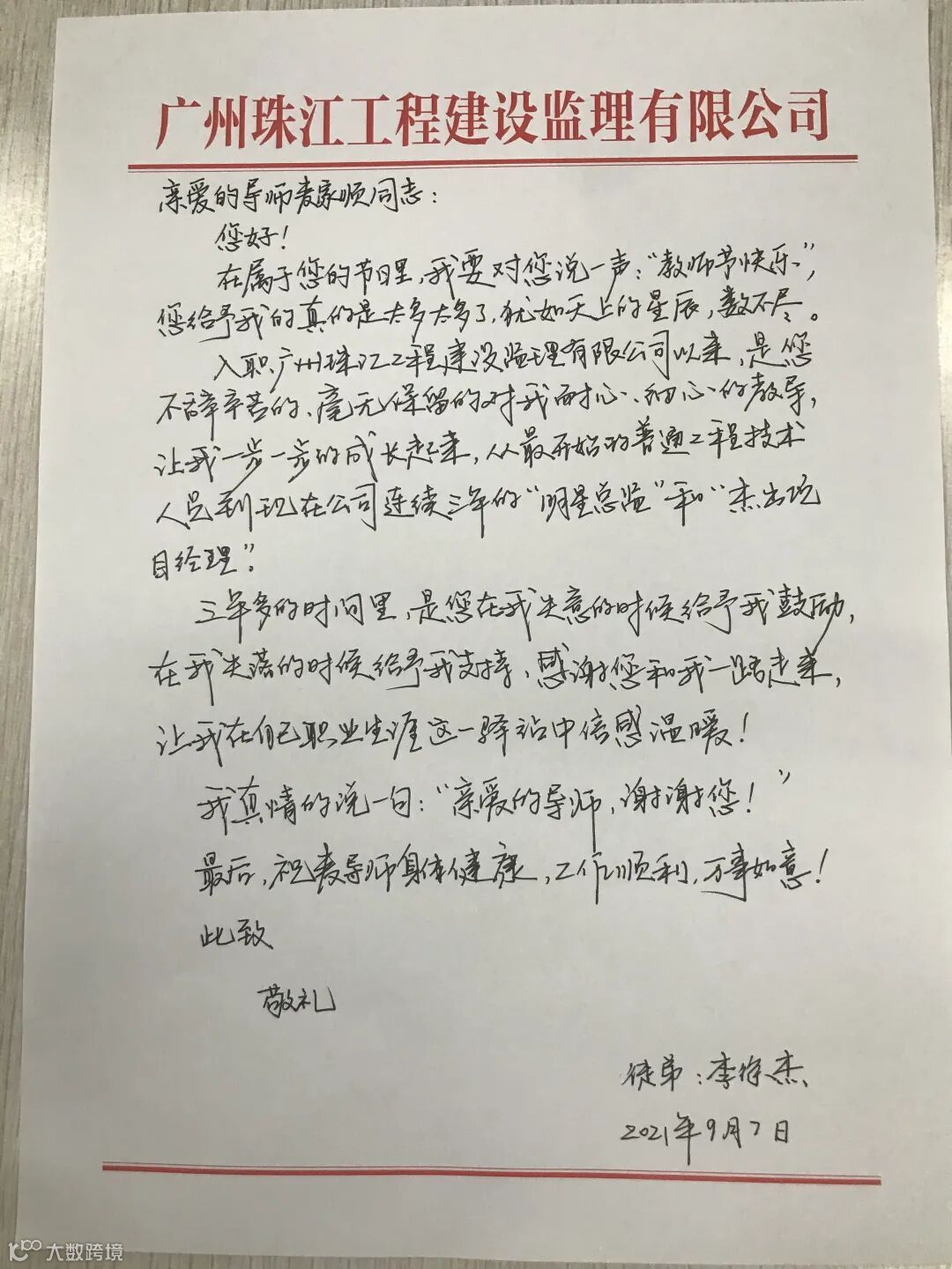 “在属于您的节日里,我要对您说一声:教师节快乐……”9月10日,集管公司麦家顺副经理的办公室桌上放着一封寄自长沙的手写信——这是第37个教师节来临之际,远在长沙珠江好世界项目总监李徐杰,写给他导师麦家顺的节日祝福与感恩心语。
