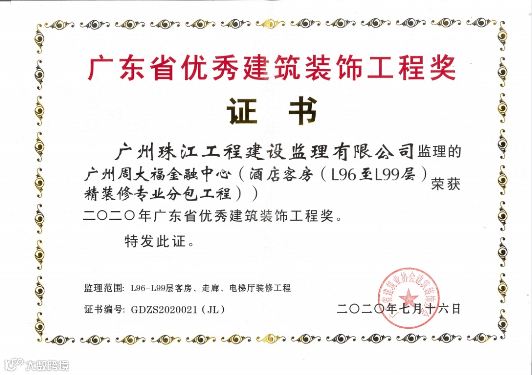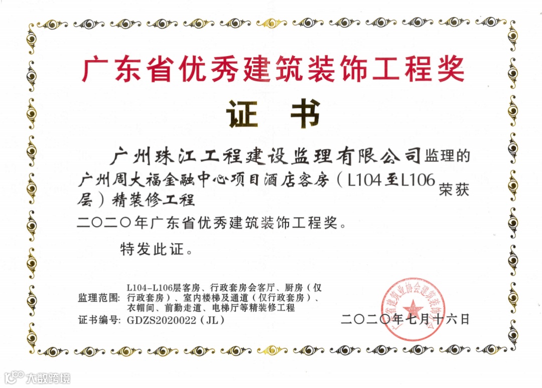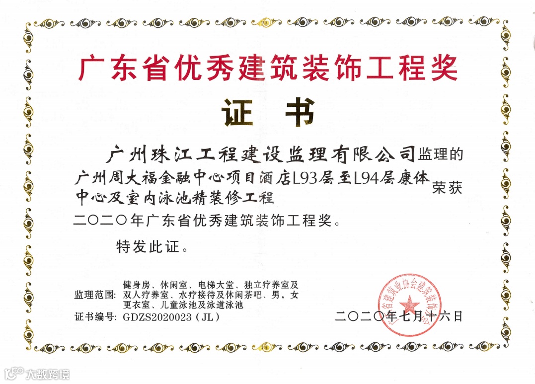 近日,珠江监理广州周大福金融中心项目酒店L93层至L94层康体中心及室内泳池精装修工程、酒店客房(L96至L99层)精装修专业分包工程、酒店客房(L104至L106层)精装修工程均荣获“二O二O年广东省优秀建筑装饰工程奖”。