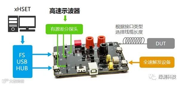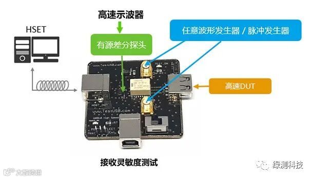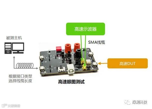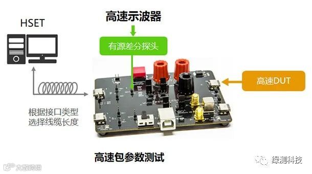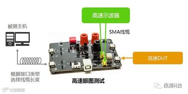 高速测试测量了发射机执行有效的高速信号的能力。在上游和下游端口上测量高速信号质量。使用最小带宽为2.5GHz的50Ω输入。通过高质量的SMA电缆(≤50cm)连接到夹具(不再使用有源差分探头)。使用USB_IF工具USBET分析信号质量。