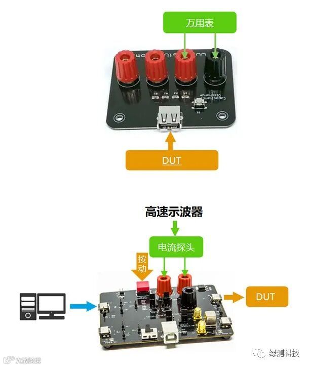 由于是DC测试,使用夹具以及万用表或者示波器测试即可。