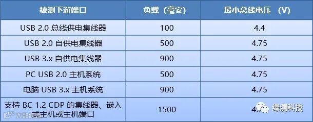测试是,通过示波器连接至待测端口夹具,利用负载测试板上电阻提供负载。根据不同的设备类型,选择不同的负载电流,并保证在该负载电流下VBUS不得低于以下值: