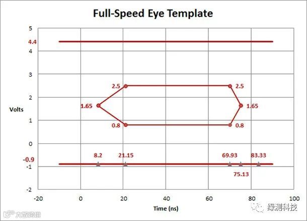 请注意区分USB 2.0高速(480Mbits)和全速设备(12Mbits)之间差别。高速设备向下兼容全速设备。这些测试测量了发射机执行有效的高速信号的能力。在上游和下游端口上测量高速信号质量。