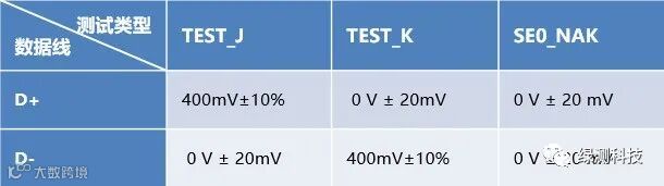 该项测试使用HESTT强制设备进入TEST_J、TEST_K以及SE0_NAK模式后,对D+、D-上电压进行测量。