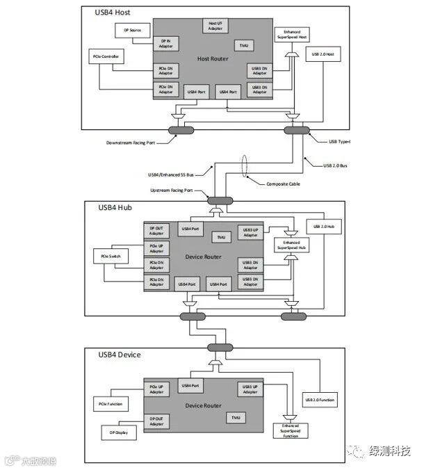 为了兼容上大量的协议,需要使用路由器进行分发。路由器是USB4架构的基本构件。一个路由器将隧道化的协议通信映射到USB4数据包,并通过USB4结构路由数据包。路由器还通过其时间管理单元(TMU)在整个USB4结构中分配和同步时间。