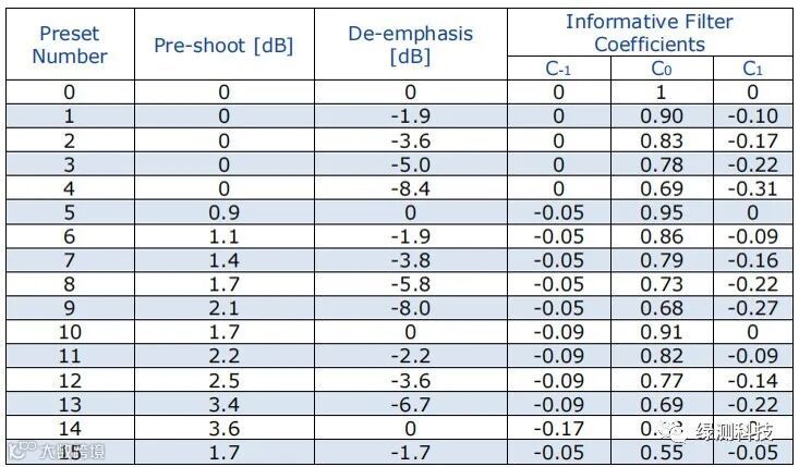 由于高速信号在传输过程中容易出现传输眼图闭合情况。USB4 要求使用传输均衡装置。该均衡器衡器的结构是基于一个3个码型的UI延时器的有限脉冲响应(FIR)滤波器。通过该结构,可根据码型的前后调整实际发送的波形,即Pre-shoot和去加重。USB4在传输过程中设置了PRESET 0 – PRESET 15,共16组PRESET值。PRESET值规定了不同的Preshoot和去加重结果,以及达到相应的pre-shoot和去加重效果应该如何设置三个FIR滤波的值。