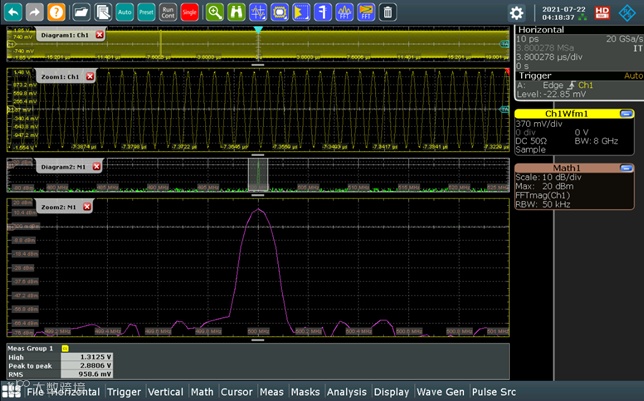 FFT:横轴频率,纵轴功率电平dBm,对应信号电压的RMS值的平方比内阻值。