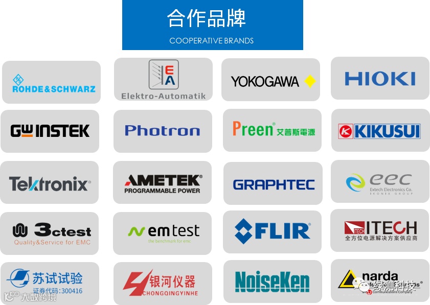 测试仪器设备:电池测试仪、微电阻计、高阻计、LCR测试仪、交/直流电子负载、功率计、功率分析仪、记录仪、EMC电磁兼容测试设备、安规测试仪、高速摄像系统、红外热成像仪、示波器、频谱与信号分析仪、电能质量分析仪、数字万用表、手机综测仪等。
